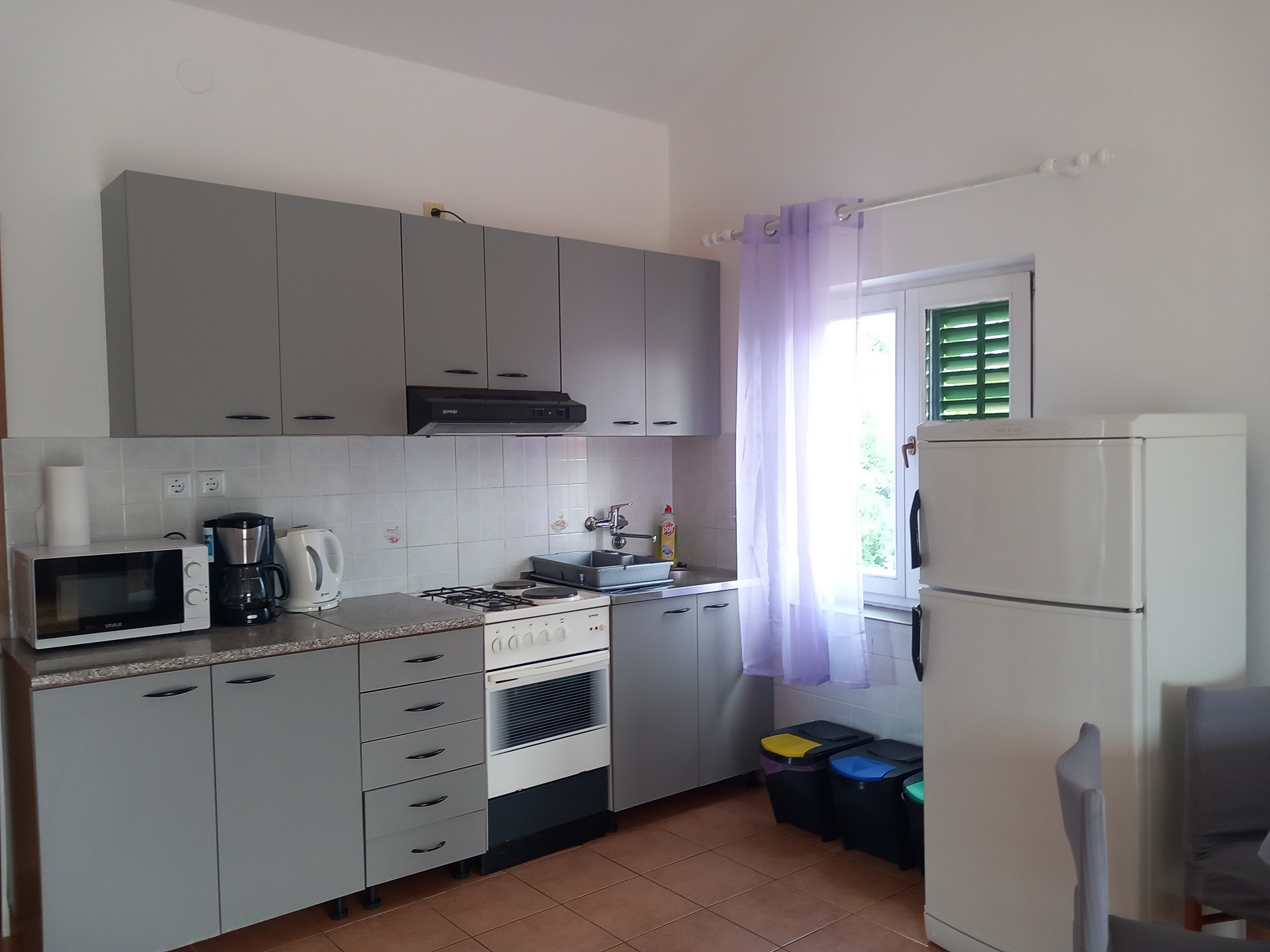 The kitchen has a fridge with a freezer, a stove with an oven, a microwave oven, a coffee machine, a kettle, and dishes.